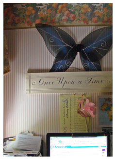 I’m so blessed to have an office in which I do my cards and my writing.  It’s comfy with a couch (for the pooch,) carpeting for my cold, bare feet,  and a window beside me where  birds feed and sing from blooming lilac bushes.  Above my desk and computer–well, I’ll just attach a photo–is an area that excites the muse within.