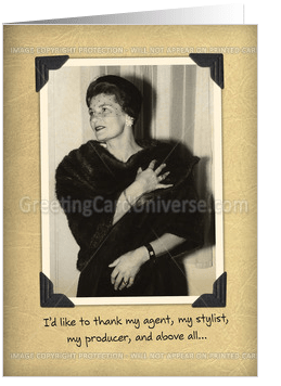 This is my Mom in the early 50’s, striking a dramatic pose. She was actually imitating my grandmother (her mother-inlaw) who was a bit of a drama queen. My Mom loved spoofing people. The photo was taken by my Dad and I added the vintage background and photo corners to give it a nostalgic look. The Academy Awards came to mind when I found this photo, so I thought it would be a fun and unique way for a woman to send a thank you card to someone. I work in Photoshop and/or Illustrator and layout my cards in InDesign.