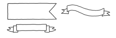 Oh, my goodness, ribbons are popping up everywhere! Above you’ll see 3 examples of the kind of “ribbons” I’m talking about. Not 3D scrapbooking-style, but either simple flat ribbons, or more elaborate ones, all with writing inside.