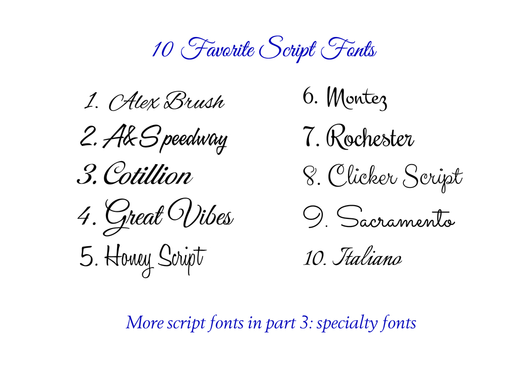 Pt-1: My 10 Favorite Script Fonts plus My 6 Favorite ‘Companion’ Fonts; Pt-2: My 7 Favorite Hand-Written Causal Fonts plus My 6 Favorite Comic-Sans Replacement Fonts; and Pt-3: Fonts to avoid and those which require a ‘light touch’, plus some fun ‘specialty’ fonts for occasional use.