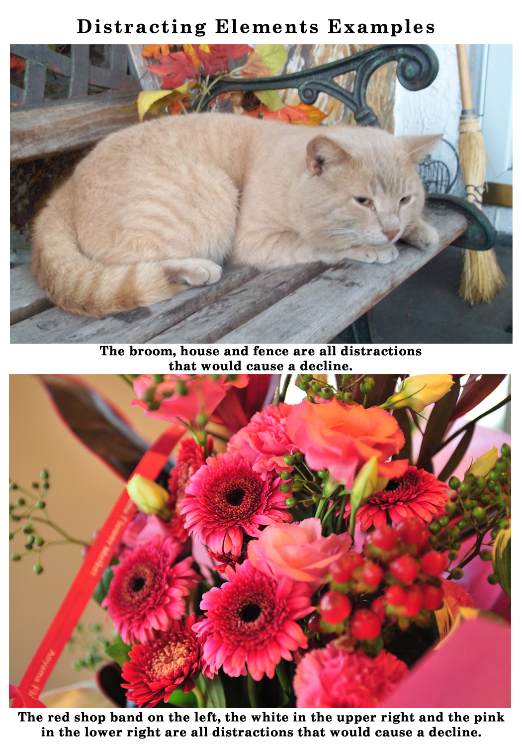 Distracting Elements and/or Background: This really should be fairly easy to understand. It does apply mostly to photographs, though could apply to digital compositions as well. It’s one of those Photography 101 lessons to compose your photograph without things like; poles sticking out of the heads of your subjects, branches and dead leaves in front of your subject, body parts that don’t belong to your subject, etc. Remember; if it does not add to your overall image then it’s a distraction. ANYTHING that draws your eye away from the subject, is a distraction. Fences, buildings, cars, etc. are all considered distractions if found in the background of your image and they are not part of the subject.