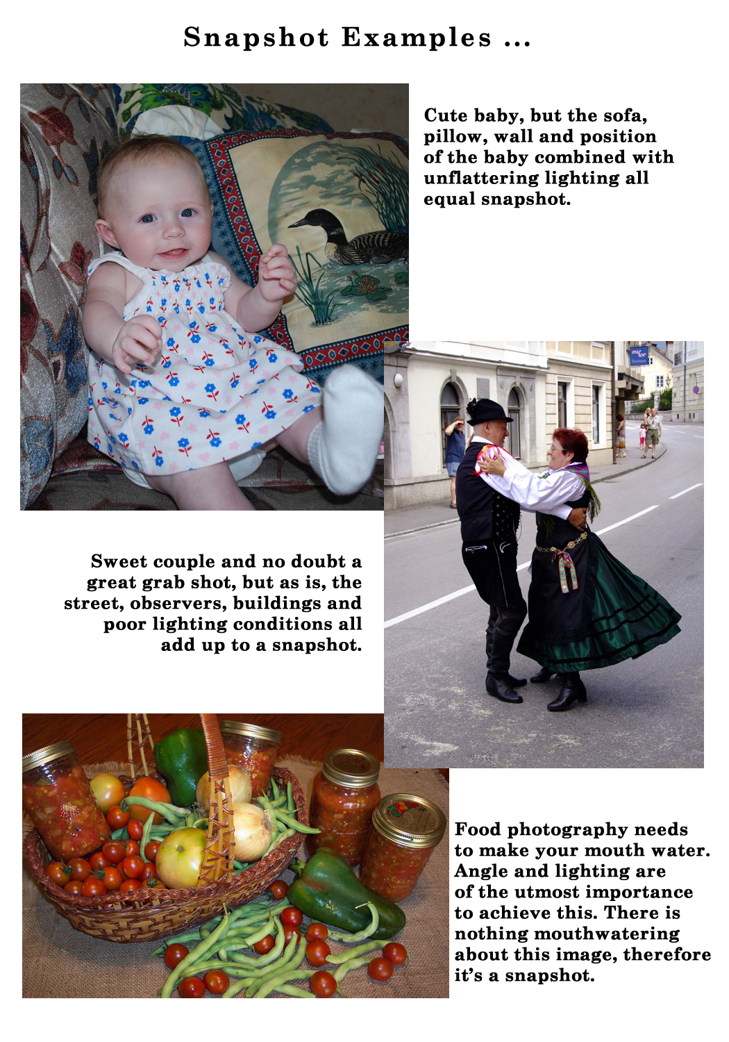 Snapshots:  For those of you who having a tough time differentiating between a snapshot and a professional shot, I would encourage you to go browse some place like iStock with a sort on most popular (try babies, pets,or home for examples). You should be able to see the difference. Snapshots of people have unwanted distractions, such as; limbs from other people, household/garden objects, etc. Snapshots have unflattering lighting and people often in unflattering positions or with undesirable expressions. We talked about buildings before – it’s nearly impossible to photograph buildings without the proper training and equipment and expect them to be considered professional in quality. Street scenes and travel photos are rarely acceptable as they almost always have a feeling of an editorial (newspaper) image or vacation snapshot. To have a photograph of food be acceptable for a greeting card, it needs to have amazing lighting and the perfect angle. If the food does not make your mouth water, then it’s a snapshot.