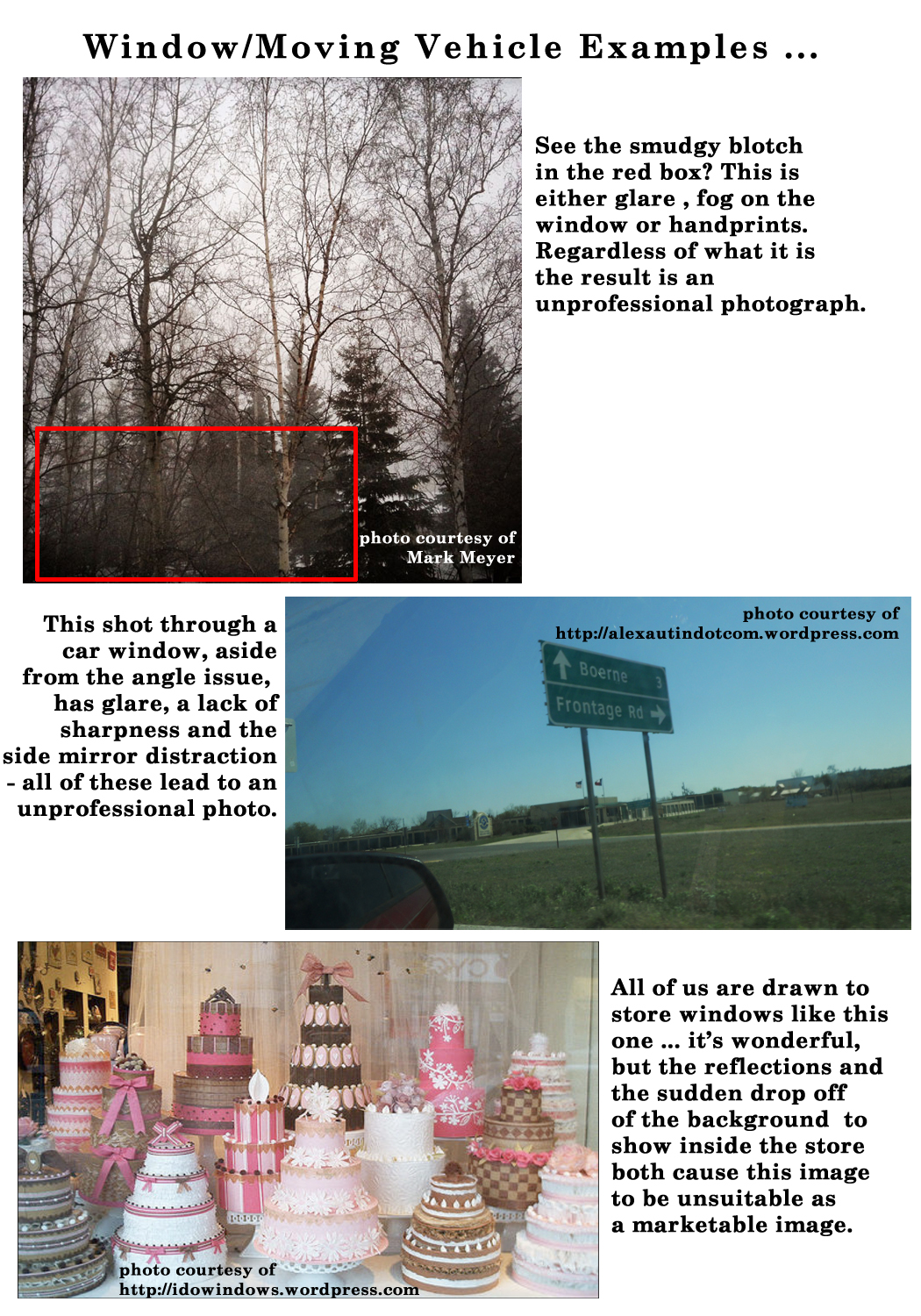 Photos from Windows/Moving Vehicles:  You might think, well duh, but you’d be surprised how many people take photos out of a moving vehicle or through a hotel/home window and think it’s a great shot. Moving vehicles cause photographs to have two issues, the reflections in the windshield/window and the added movement of the camera causing camera shake. Not to mention the portions of dashboards and car doors that often end up in the image. Photographing through a window, even from home, will show finger prints, smudges, and water spots in addition to adding blur, reflections and flare.  It doesn’t mean there aren’t exceptions to the rule. There will always be a small handful of those rare occasions when everything fell into place for a great shot against all odds. However, these exceptions are accomplished when the photographer applies special techniques to reduce reflections and camera shake.