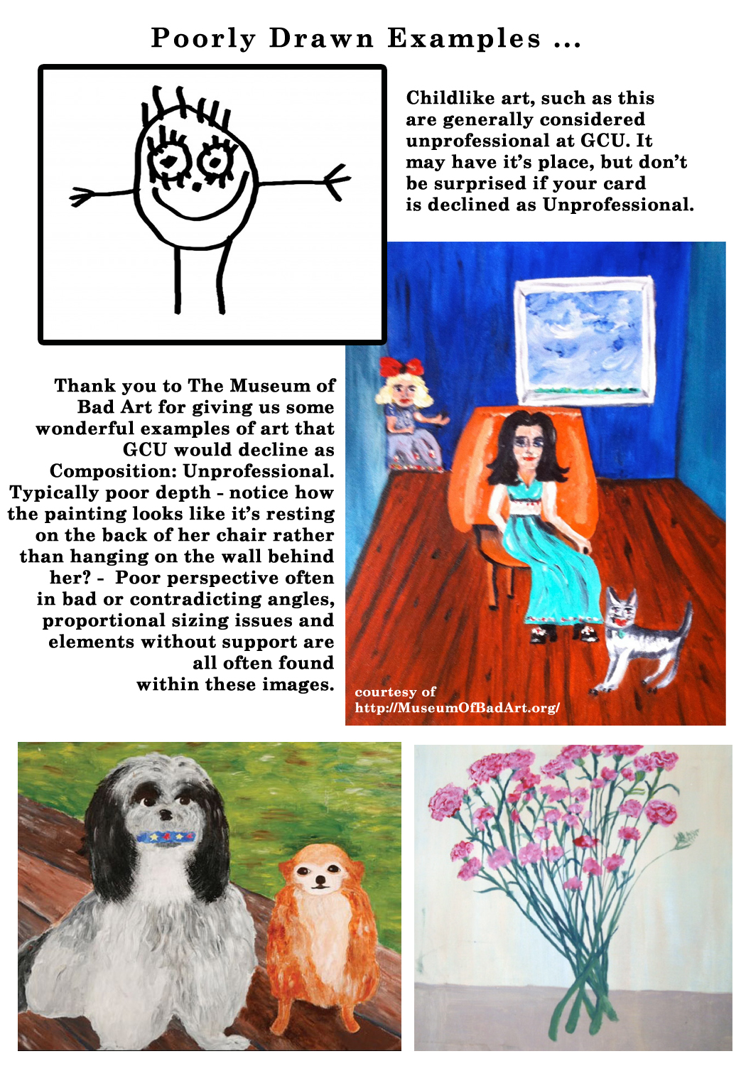 Messy, Distorted, Poorly Drawn Art:  Many of you may say that this is very subjective and I suppose to some small degree it is, however it really is easy to see the difference between a drawing/painting of someone who has not developed any real technique compared to the imagery of those artists who work in a trained yet whimsical style. Generally, declines for this area are those which look like a child drew them. They often lack depth, have poor perspective, unsupported elements and/or proportional issues.