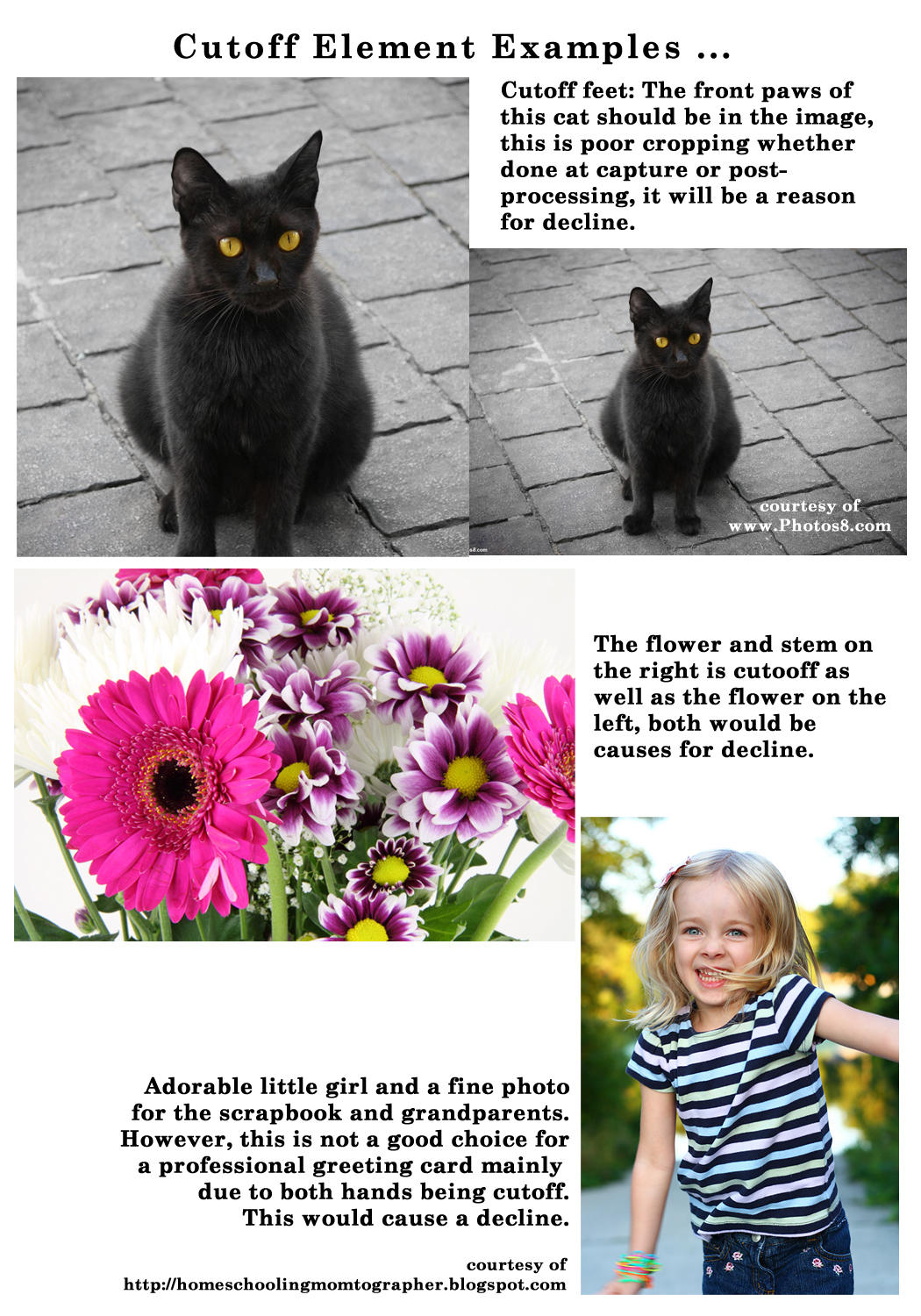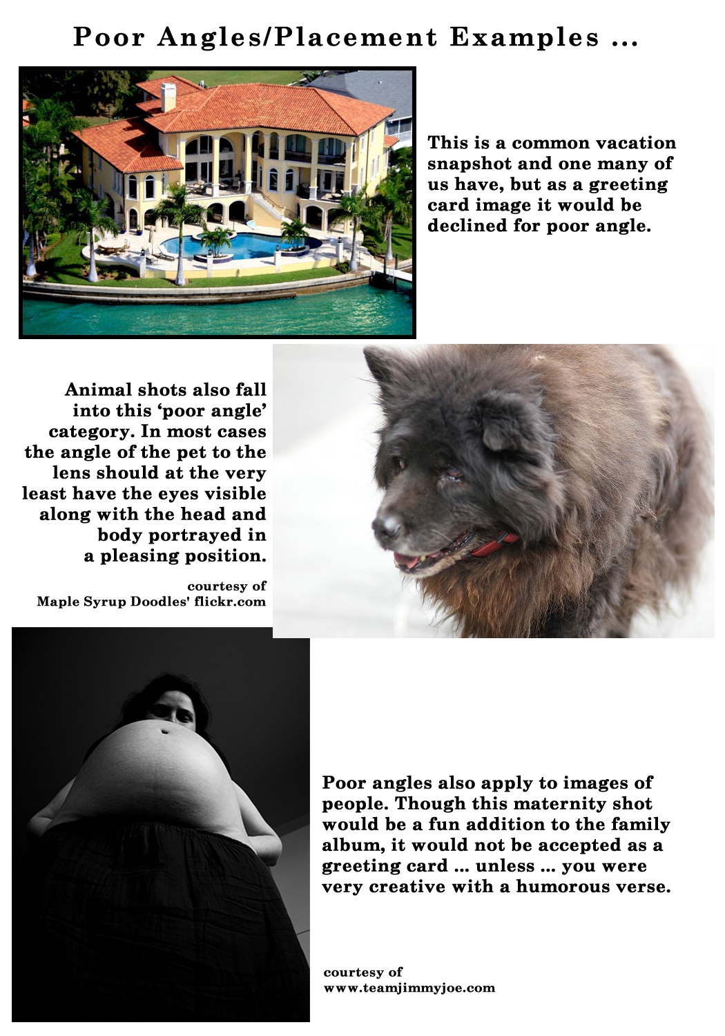 Poor Angles: Again, other areas of the guidelines overlap with this area depending on what the reviewer sees in the image. Many of these poor angle images are considered snapshots, because the photographer either didn’t find the right place to offer the best angle when composing the shot, or couldn’t get to it. This also comes into play with photographs of pets and animals. Just because Pooky Bear look adorable, doesn’t necessarily mean it’s a good image for a greeting card. These types of images are fine for your personal use, but are not considered marketable in the greeting card industry.