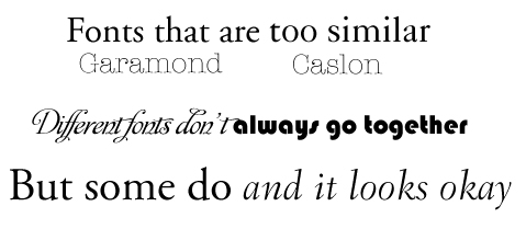 FONT CONTRAST: If you’re planning to mix fonts – which can be a very good thing – be aware that fonts which are too similar don’t look good together, but neither do fonts that are too different. Again, the most hard and fast rule of typography is to keep it PLEASING TO THE EYE. TIP: to create CONTRAST not CONFLICT, you must consider weight (that’s how fat the font appears), size (mixing sizes is okay for emphasis), and whether or not the two (or more) fonts look good together. Fonts that look too much alike don’t work. Neither do fonts that aren’t similar enough.