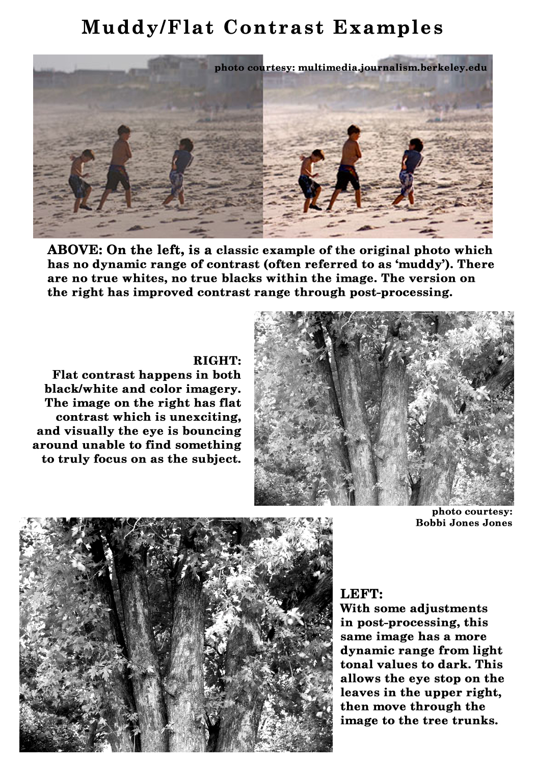 Muddy/Flat Contrast:  A flat-contrast scene has colors or tones in which highlights and shadows have very little difference in densities. In other words, all colors or tones within the scene are very similar in appearance. As in all areas of photography and other mediums, there are always exceptions to when a ‘flat’ contrast image is perfectly acceptable, such as; a white cat against a white background may be considered ‘flat’, however as long as the whites are truly white and not closer to gray and there is a definite ‘punch’ in the contrast between the cats eyes with the rest of the image, this would be considered an acceptable exception to the rule.