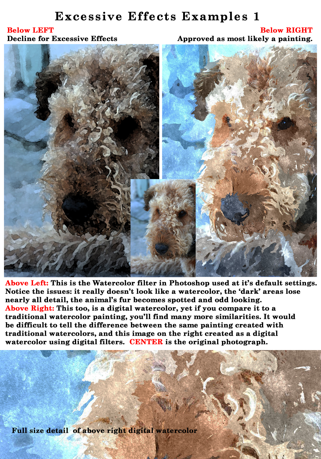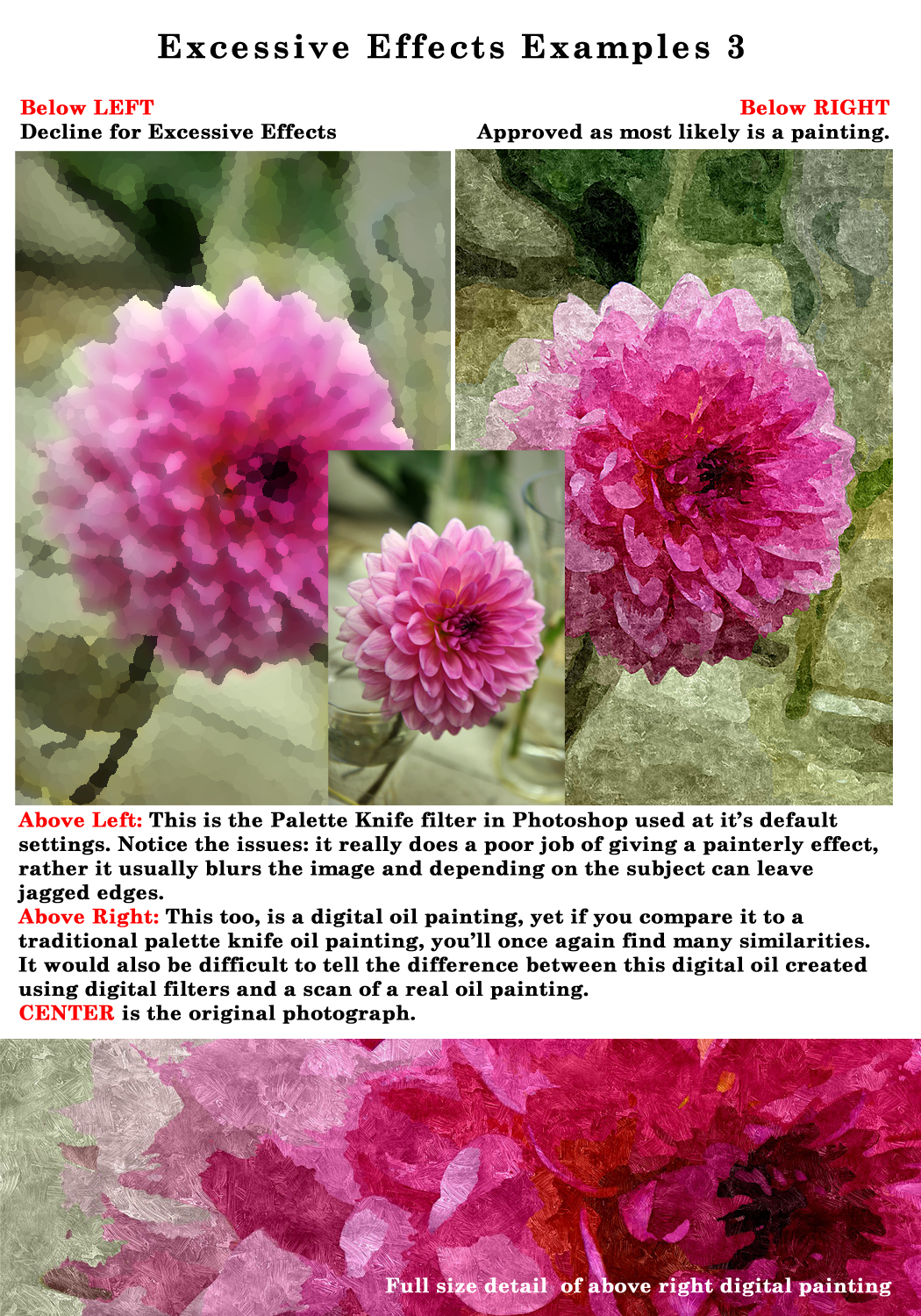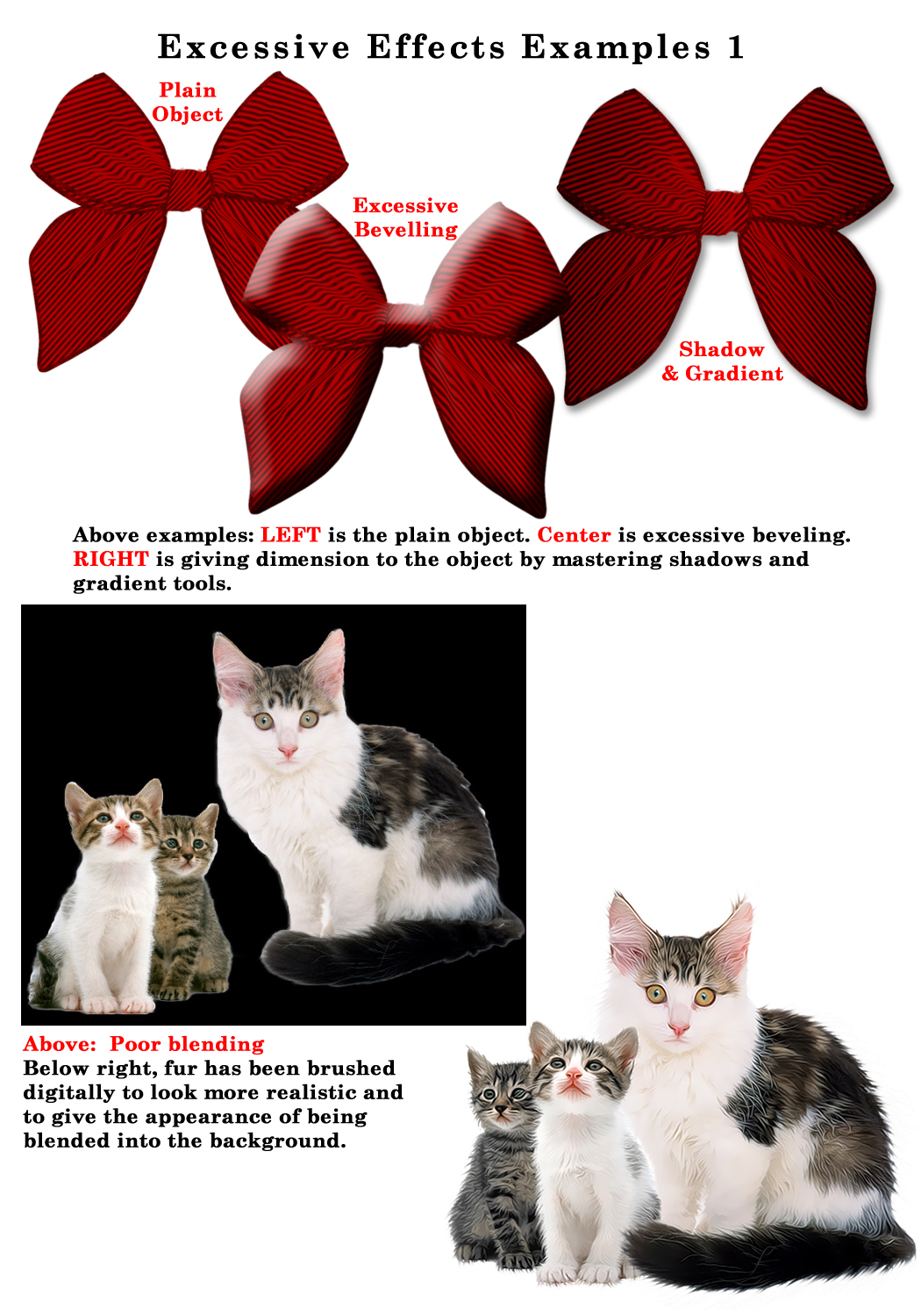 Artists should use a light hand when using special effect filters and blending options offered in digital software. There are many tutorials on the Internet on the use of the various filters available. Filters are not intended to be used in their default settings; it often takes a lot of tweaking and the use of more than one filter or blending mode to achieve an attractive image. A filter will not save a bad photo. Declines may include, but are not limited to: excessive beveling on objects, text and borders, overuse of digital filters, poorly executed effects, poor blending from masking and background removal, etc.