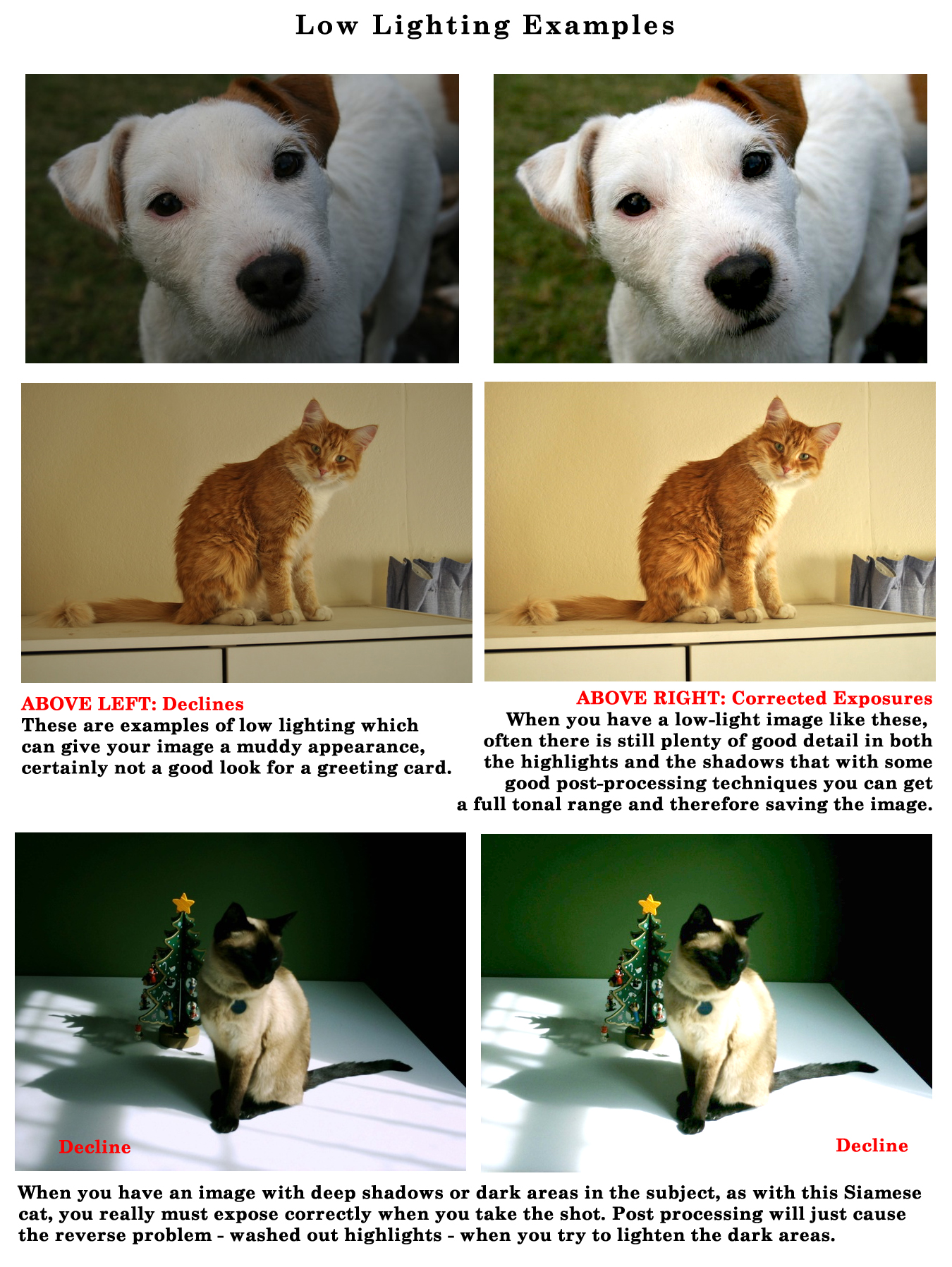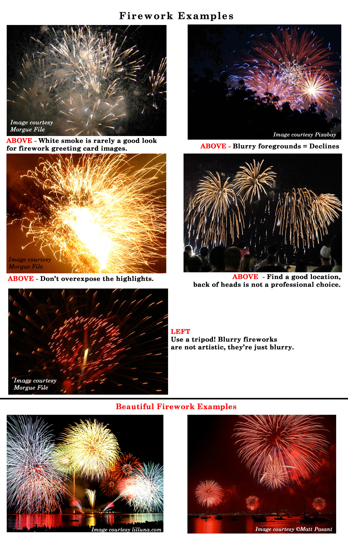 Very Low Lighting: Just as harsh lighting is not acceptable, neither is an image that’s simply too dark. Not only is this usually not attractive, it’s a problem for printing when low lighting causes a lack of contrast and tonal values. Low lighting also causes problems from camera shake when hand-held. Such as a moving subject like fireworks, if you wish to photograph fireworks for your greeting card images, then use a tripod and ensure your exposure captures the detail in the highlights without washing out the sky, AND stops the motion of the fireworks. You may consider poorly lit light swirls from an exposure which is too slow as an artistic move, but at GCU it’s most likely a decline.