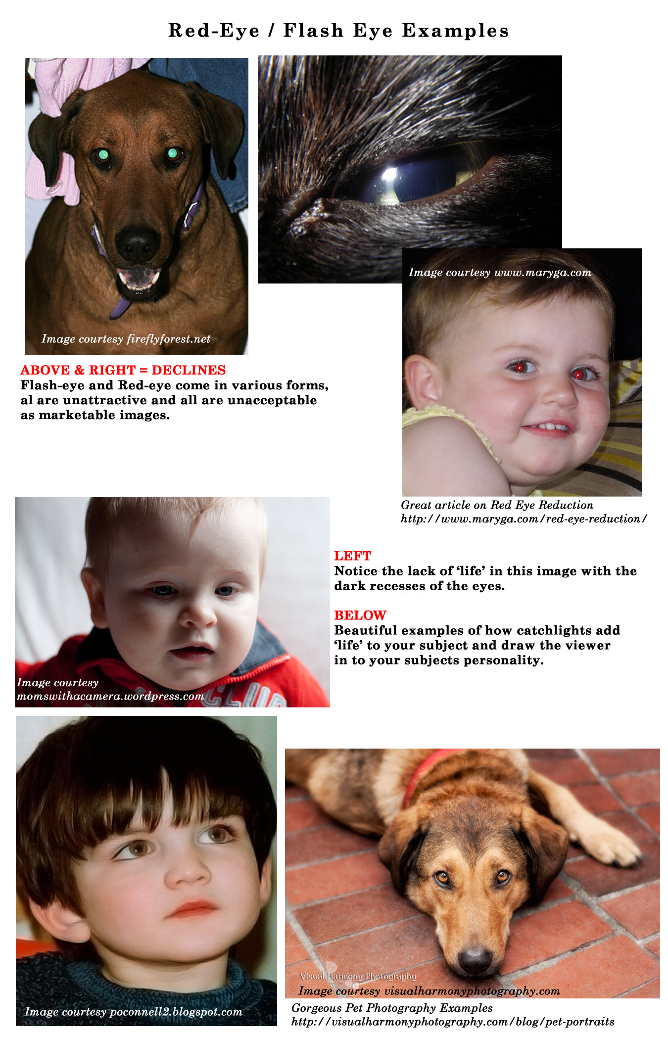 Flash Eye (Red-Eye): Whether the eyes of your living being are yellow, green, red or simply just showing no pupil from the flash, all will be declined. Eyes which do not show pupils and a ‘catch-light’ are considered to look ‘lifeless’ rather than the eyes of a living being with personality. This applies to people as well as animals. Photographers learn early in their training how to avoid ‘flash-eye’ and how to create those all important catch-lights.