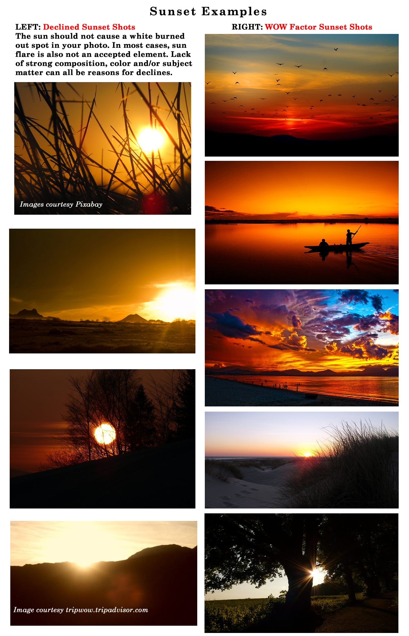 Sunsets: Sunsets are like flowers, every person with a camera shoots them, but not all of them are worthy of anything more than being in your family album. Sunsets need to have a wow factor to stand out in the crowd of today’s competition. If the sun looks as though it has burned a hole in the image, it’s likely to be declined. Tips for creating a sunset photo with that ‘wow’ factor: