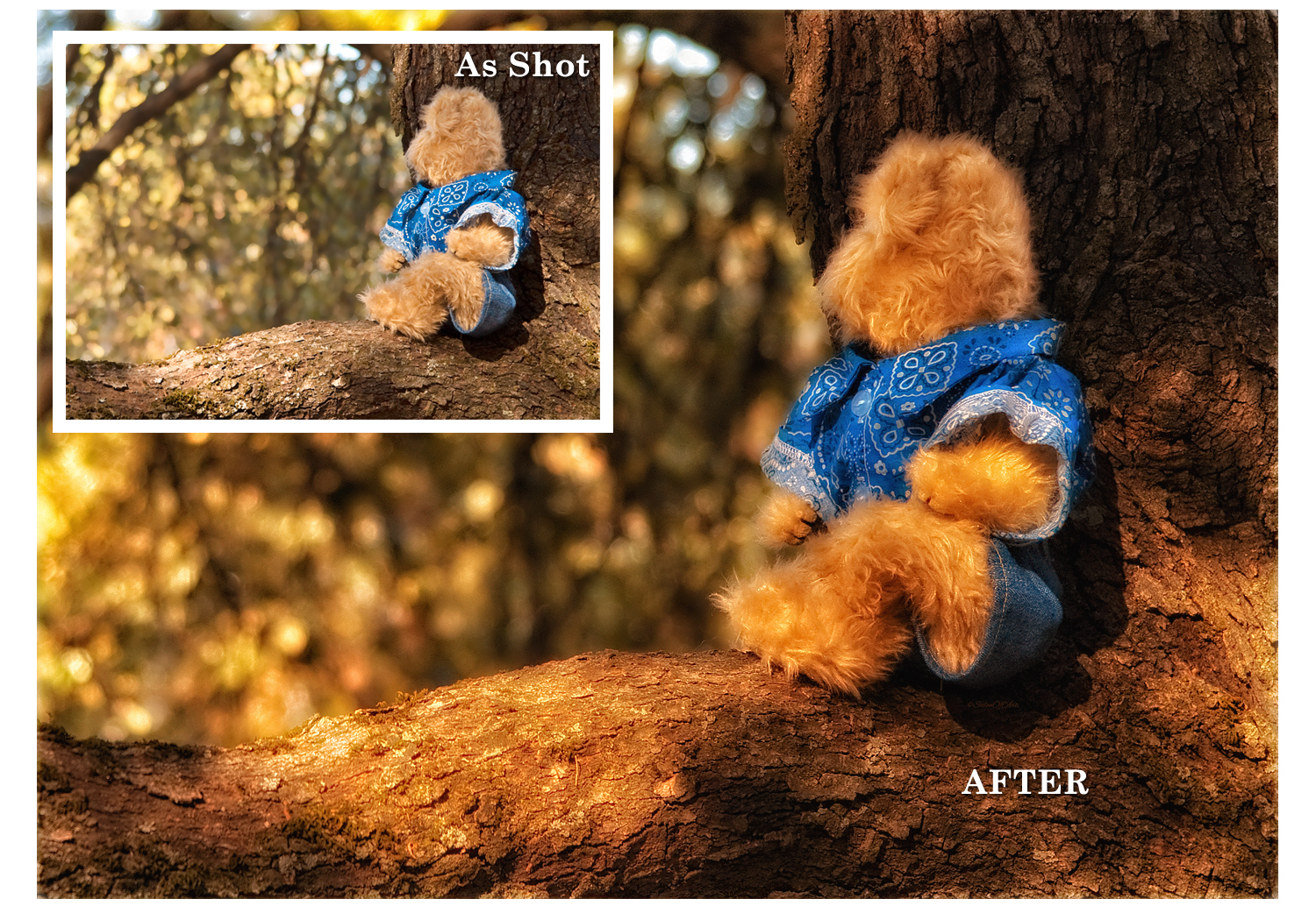“Getting My Bearings” – The untouched photo of the teddy bear in the upper left has no real technical faults, however as a marketable image it lacks the dynamic impact to support the emotional connection I wished to convey when I originally set the shot up. By adding a soft dreamy effect, increasing the saturation, tonal values and pulling out detail in the bark and fur of the bear I was able to create an image with that all important “WOW” factor.