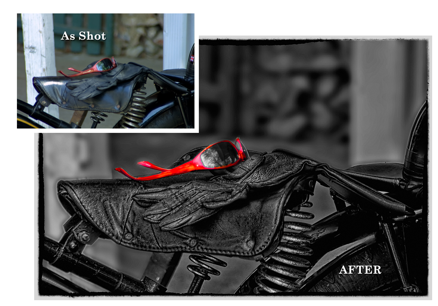 This last example of mine was a snapshot I grabbed while on a quick break during an all-day motorcycle ride through the mountains. I loved the composition and vintage feel of the scene I saw at that moment, but knew the photograph would be nothing more than a horrible grab-shot.  I worked with all the tools above in Photoshop to transform this ugly snapshot into a highly-textured, hand-tinted piece that motorcycle enthusiasts just love.