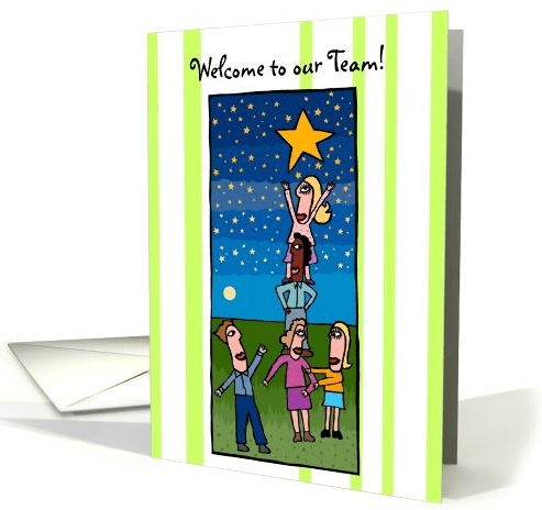 “A multicultural group of men and women reaching for the stars in a night scene on a green striped background. Perfect card to welcome a new employee or new hire to your team.”