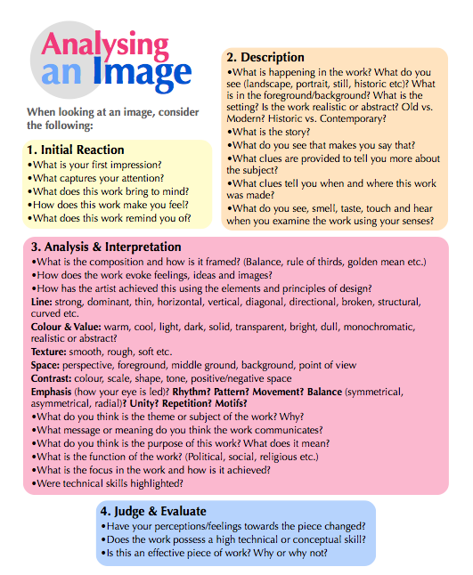 Doreen, this is a great resource. You have covered all aspects of self critique. I like your visual designed the “Analyzing an Image” information.