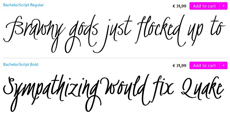 Handmade calligraphy fonts are all the rage at the moment, so take advantage of this deal at MyFonts, which is offering Bachelor Script – a family of two fonts, regular and bold – at a limited time discount of 60% off! The lines look great, free flowing yet sharp and crisp. Really terrific for formal occasions or used for emphasis and coupled with a professional sans serif font. Deal ends February 6. Examples below (don’t pay attention to the prices). Have fun!