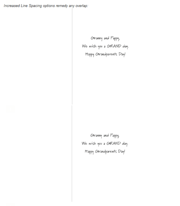 You should give consideration to the alignment and spacing of your inside verse.  You have three controls:  message alignment, vertical alignment and line spacing. Overall the alignment and spacing should be pleasing to the eye in flow, balance, and easily legible.  In general, the default settings are usually best however there are some exceptions like invitation inside text and a few others.  Below we have addressed an important one that often goes overlooked, overlapping text.