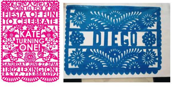 See the finished inside below which is a full bleed 10×7 image that I uploaded to the inside of the card just like any shopper can do with an image/photo. I adore the layout, colors and papel picado concept. Looks like I was a busy bee clipping each card with my little scissors!