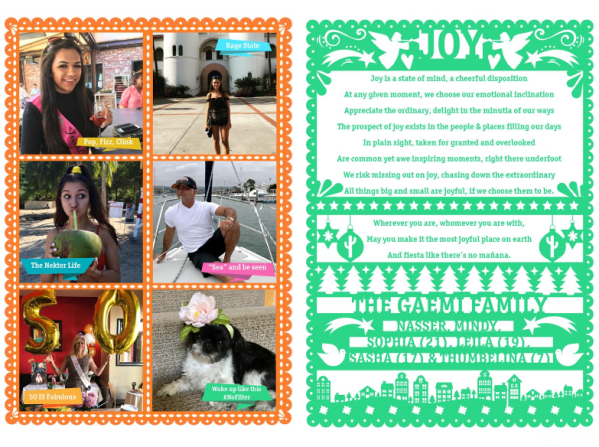 Our family had an action packed year with landmark birthdays, weddings, filled with special trips, opportunities and people. Feeling pretty darn fortunate and grateful as the year came to a close I felt an overwhelming feeling of joy. Joy for all things that happened in our year – big, little, good, and not so good. This provided fodder for the inside verse on choosing to find Joy. Plus featuring a photo of each family member doing something that brings them joy. I always have a lot to say, much more than what space permits on the inside, so the artist has to be very creative in shoe-horning it in.