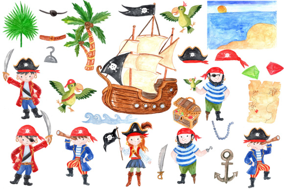 As today is talk like a pirate day, we have found a very appropriate freebie for you. Creative Fabrica offers free Pirate Themed Kids Clip-Art (26 hand painted elements in PNG (transparent background) in high quality 300dpi resolution). The offer is available for 2 more days, so better hurry!