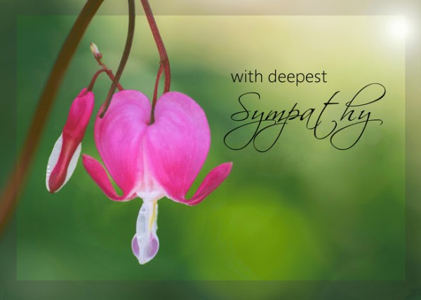 Please remove the frame. Please remove the flare in the upper right side as this may be perceived as a print error. Please choose a different font style as Scriptina font has kerning issues especially with the word sympathy. Please clone out the blurry stem on the left side as it distracts from the delicate flower.