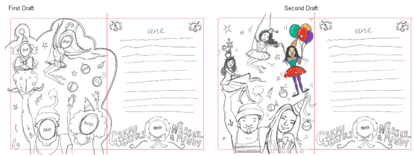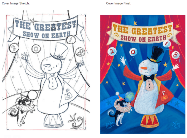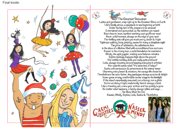 I hadn’t had a store on Greeting Card Universe for very long when Mindy contacted me in December to enquire if I could create her family Holiday card.  She had seen a Juggling themed Snowman design of mine and wanted a Circus Themed card created.  With the time limit it was a little scary but sometimes a deadline is good for us creatives!  Although I haven’t seen the movie “The Greatest Showman” (Am I the only one?) the image had that vibe, and with a Circus theme an illustrator can indulge in rich colours which is always fun and very much suited my natural style.  The inside of the card proved to be more complex content wise so I opted to illustrate in a more cartoon style with slight caricatures of Mindy and her family again in a circus theme, which I’m sure raised a giggle from them all.  I think it all came together nicely in the end and she seemed to be delighted with the design to send to her friends and family.