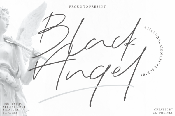 FREE Black Angel Font. This is asignature text with natural style & flow. Beautiful and elegant fonts with natural hand scratches. This signature font is perfect for weddings, watermarks, branding, such as interviews, business cards, product logos, etc. Black Angel is perfect for branding projects, logos, wedding designs, social media posts, advertisements, product packaging, product designs, labels, photography, watermarks, invitations, stationery, and any project that requires a sense of handwritten signature.