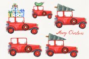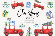 Watercolor Christmas Cars Clipart set included elements, backgrounds, seamless patterns.