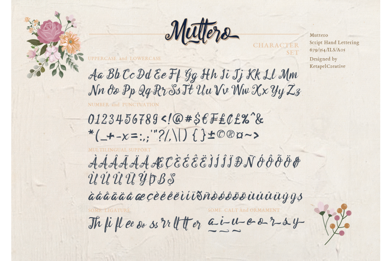 Muttero is a gorgeous hand-lettered script with an authentic twist. Fall in love with its unique charm! Available in uppercase/lowercase letters, standard numbers, punctuations, ligatures and contextual alternates!