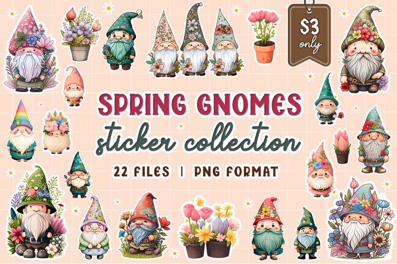 This week’s freebie on the Hungry Jpeg site is Spring Gnomes. 22 PNG stickers.