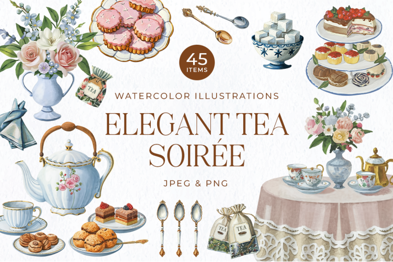 Introducing Elegant Tea Soiree Clipart by TheHungryJPEG Crafts . Discover sophistication with our Elegant Tea Soirée Watercolor Collection, exclusively at TheHungryJPEG.com! Elevate your designs with 45 exquisite JPEG and PNG files featuring vintage teacups, delicate floral motifs, and chic tea party elements. Each handcrafted illustration exudes timeless charm, perfect for invitations, stationery, and digital creations. Transform your projects into elegant masterpieces with our versatile assortment of tea-inspired graphics