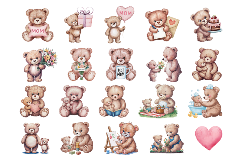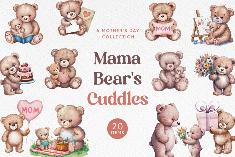 Introducing Mama Bear’s Cuddles Watercolor Collection! Celebrate Mother’s Day with adorable teddy bear illustrations, perfect for crafting, digital projects, and gifts. This heartwarming collection features 20 PNG files of mommy and baby bears, beautifully hand-painted in watercolor. Bring warmth and love to your designs with Mama Bear’s Cuddles, available at The Hungry Jpeg.
