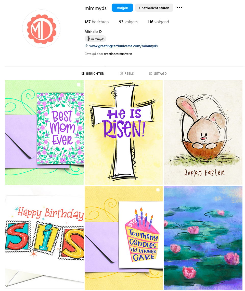 Here is an example of what a profile link to your GCU storefront looks like (if clicked from mobile device which is most likely, it will launch your cards on GCU’s mobile interface), thanks to GCU artist Michelle Downs of MimmyD’s cards: