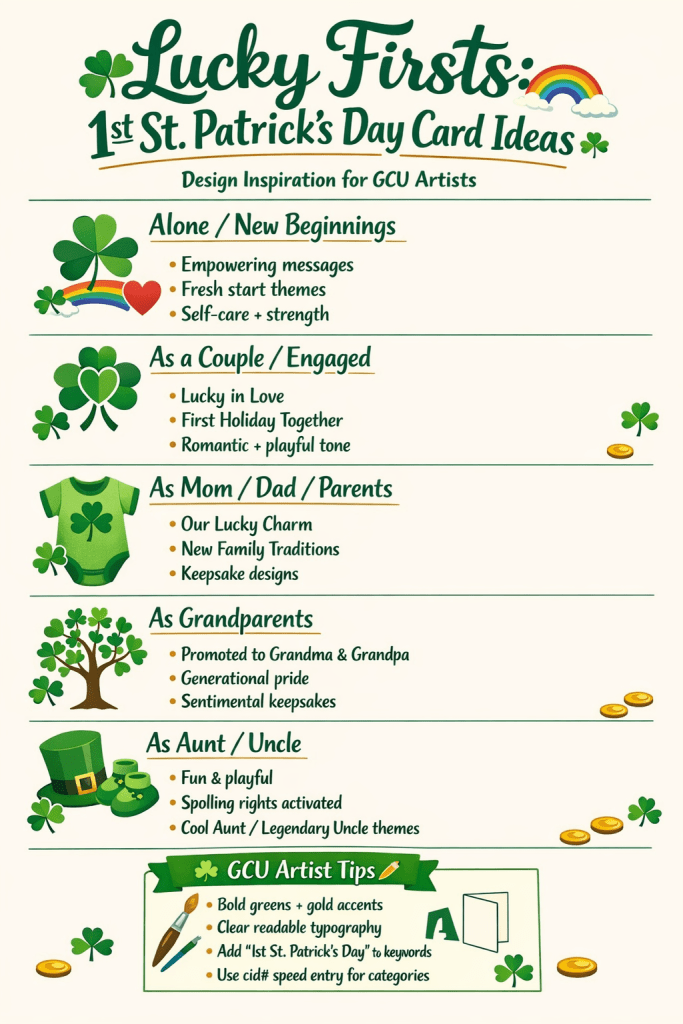 From a first St. Patrick’s Day as a couple to a first one as grandparents, these milestones are full of sentiment, pride, humor, and fresh beginnings. That makes them perfect inspiration for GCU artists. Remember, our format is the classic folded 10 x 15 inch card, landscape or portrait, so think bold focal imagery, strong typography, and room for heartfelt or playful messages inside.