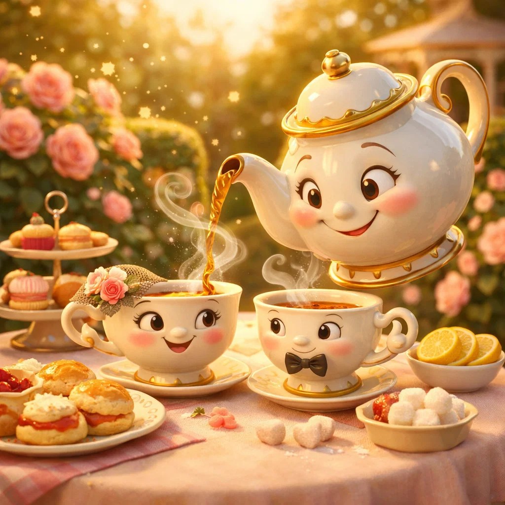 Fine bone china, floral patterns, lace tablecloths, scones, lemon slices. Soft pastels or rich heritage tones. Ideal for UK-focused National Tea Day cards.