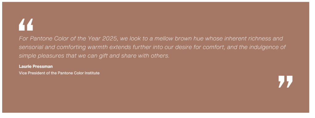 Mocha Mousse introduces a rich, warm brown that hasn’t been seen in Pantone’s selections for over a decade