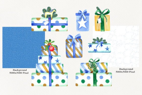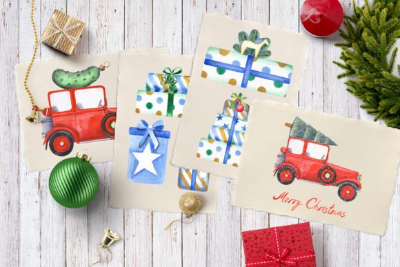 Watercolor Christmas Cars Clipart set included elements, backgrounds, seamless patterns.